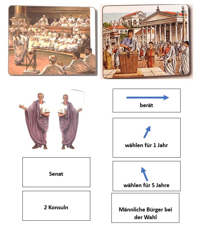 2) Konstruiere in deinem Portfolio eine Grafik mit der Überschrift “Der Aufbau der Römischen Republik”. Verwende dafür folgende Beschriftungen und Bilder: